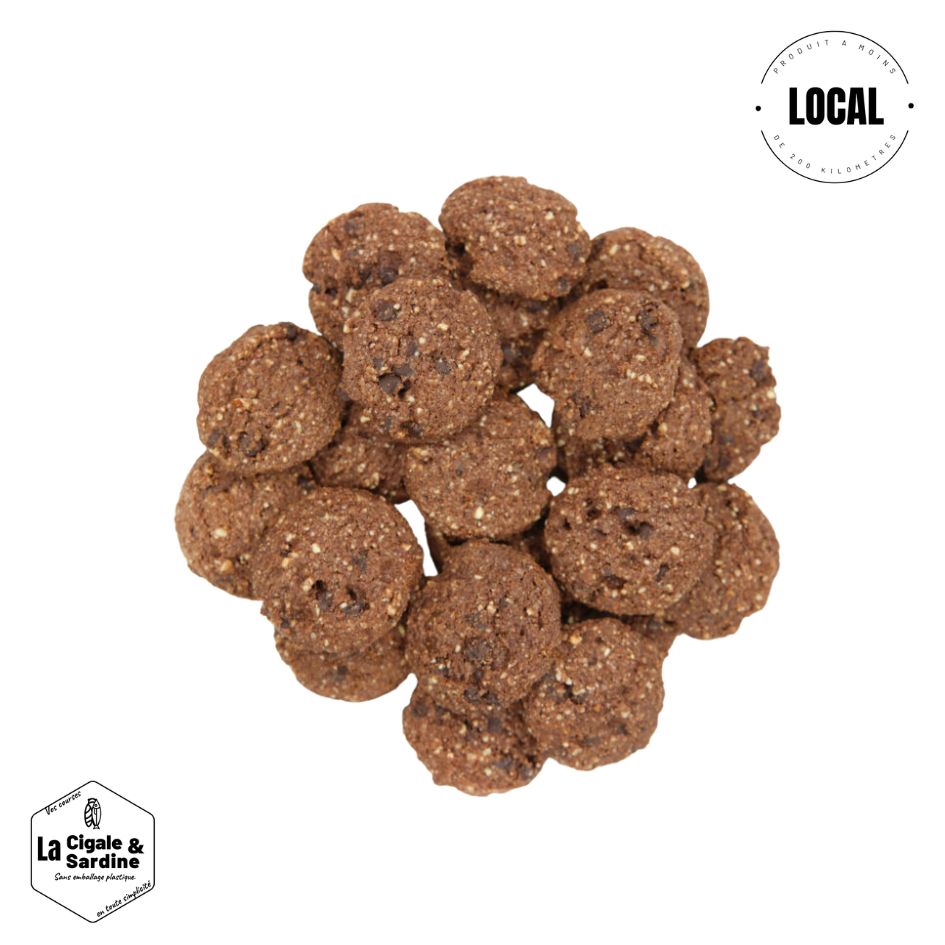 AMANDES en poudre* 24%, sucre° de canne non raffiné*, farine de châtaigne* 14%, huile de coco non hydrogénée*, pépites de chocolat° noir* 12% (pâte de cacao°*, sucre° de canne*, beurre de cacao°*, extrait de vanille*), farine de riz complet*, poudre de cacao* 3%, sel de Guérande. * Ingrédients issus de l'agriculture biologique. °Ingrédients issus du commerce équitable. Biscuits fabriqués dans un atelier n'utilisant pas de gluten.